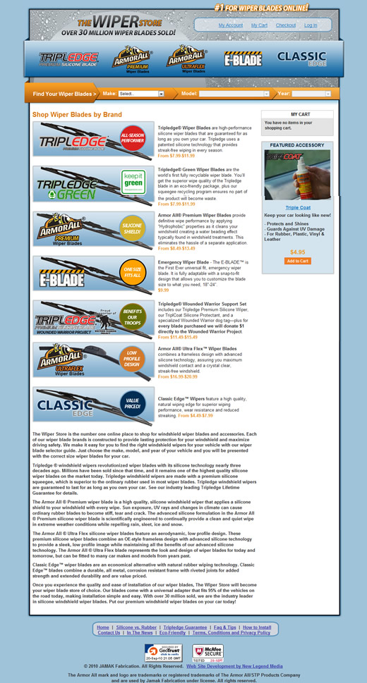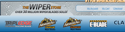 The Wiper Store ecommerce site features an assortment of premium wiper blades. A selection tool guides the buyer to the correct selection based on their automobile model and year.