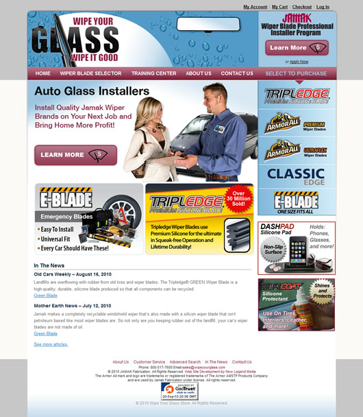 The Wipe Your Glass web site offers products for sale as well as training for installers. New Legend designed this custom ecommerce solution to be simple, but impactful.