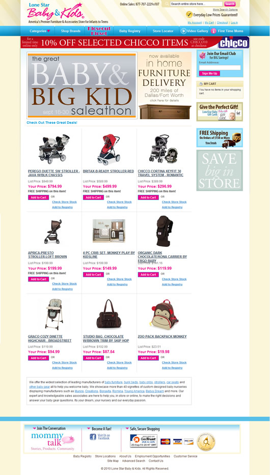 The Lone Star Baby web site helps the buyer easily select merchandise by brand, category and sales. New Legend designed an ecommerce solution that is functional and easy to navigate.